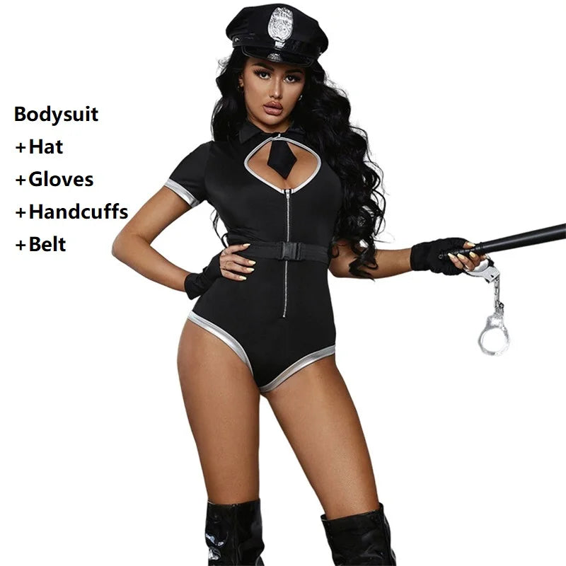 Women's Stylish Roleplay Police Uniform Lady Sexy Hollow Out Pushed Lingerie Bodysuit Cool Girl Night Club Fliter Cos Costumes